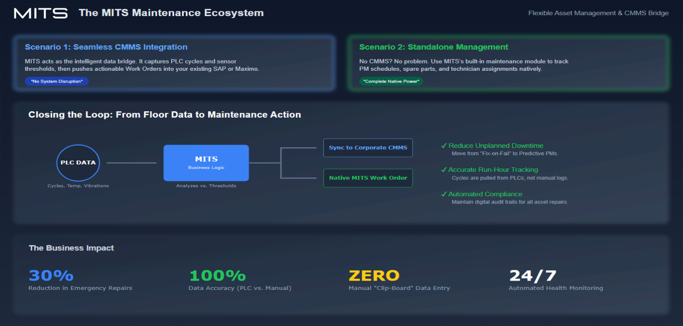 Connect MITS directly to existing CMMS platforms or utilize its built-in maintenance management capabilities. This flexibility allows organizations to align maintenance execution with production data without disrupting established systems.