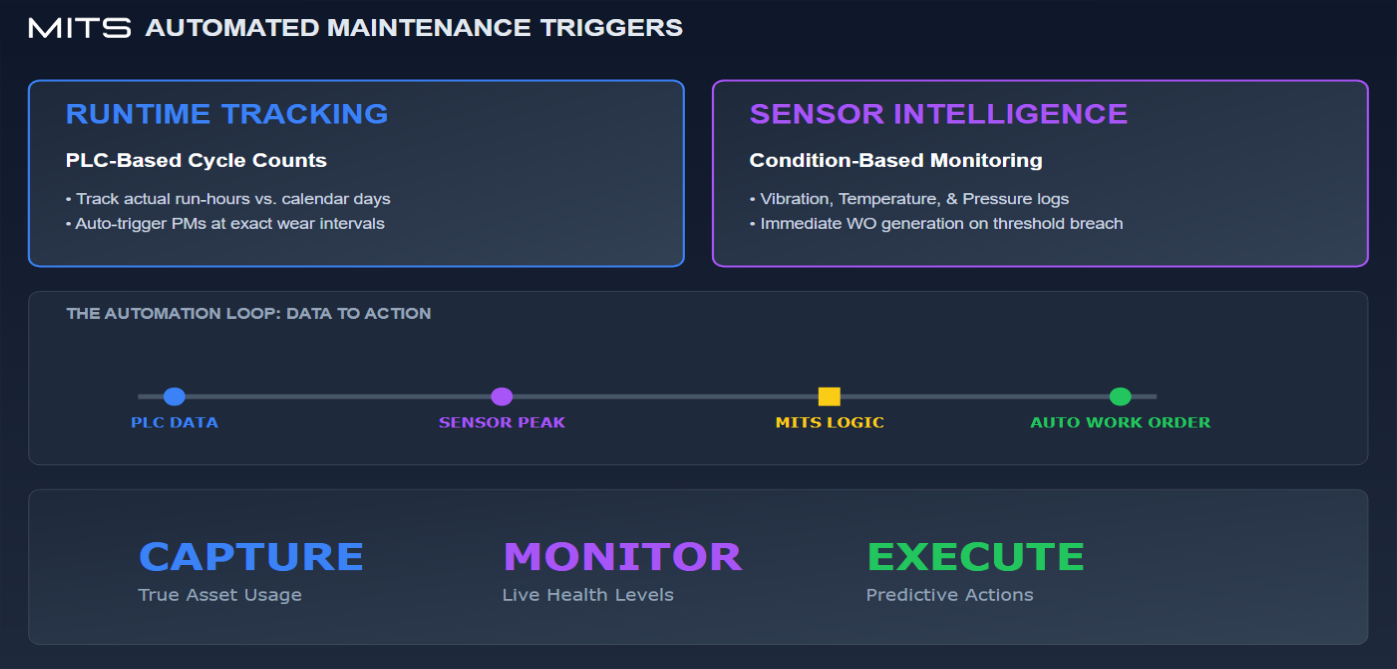 Trigger maintenance activities based on real-time equipment conditions, production events, or performance thresholds. This enables a shift from reactive maintenance to condition-based and predictive strategies.
