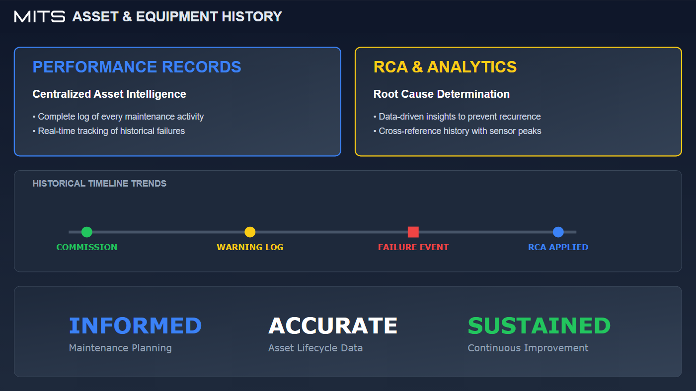 MITS tracks and trends KPIs such as MTBF, MTTR, and maintenance backlog using real execution data. These insights support data-driven decisions to improve reliability and reduce long-term maintenance costs.