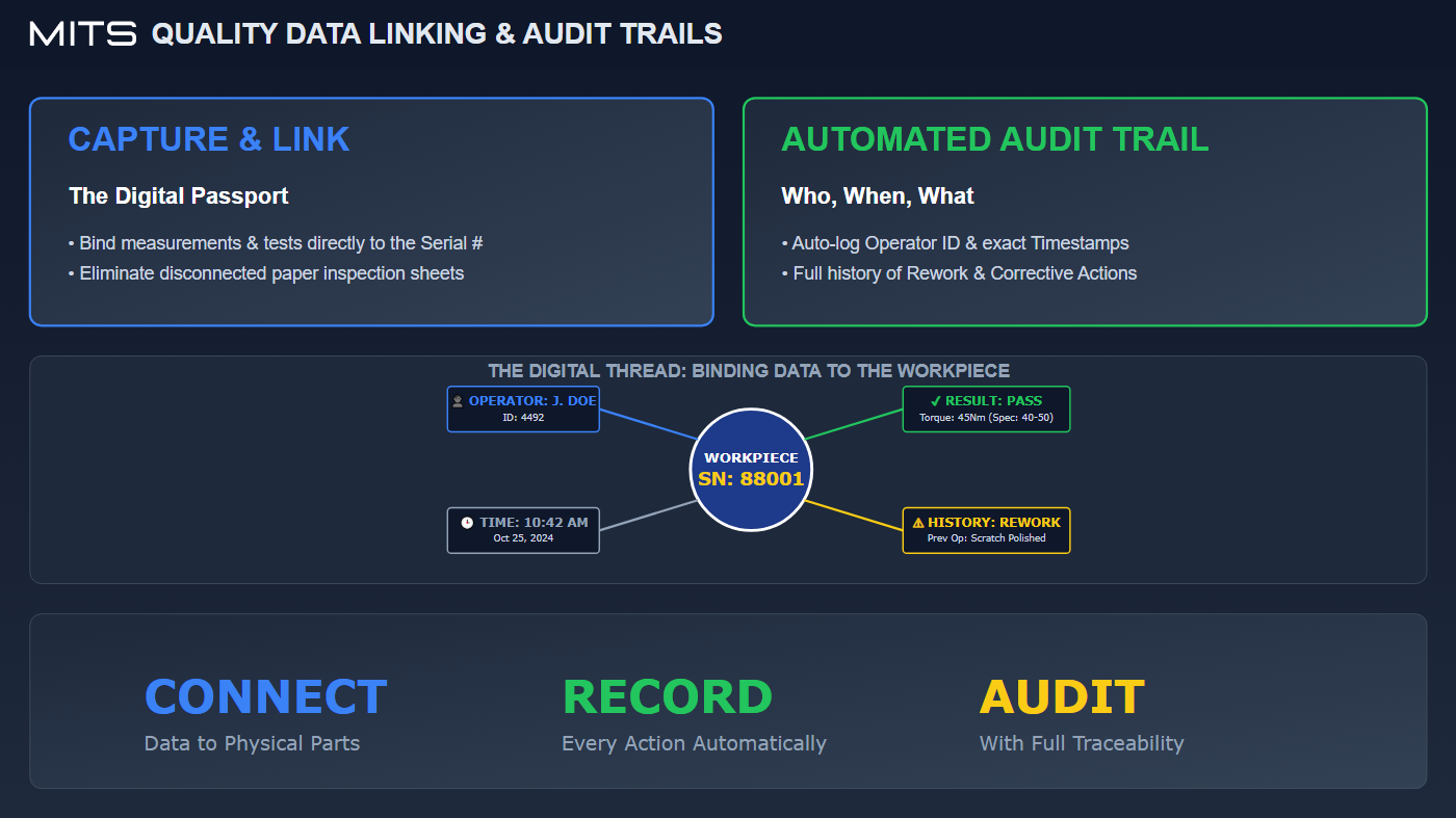 With quality records captured automatically as work is performed, MITS provides audit-ready documentation without last-minute data gathering. Auditors can be supported with complete, time-stamped records tied directly to production activity.