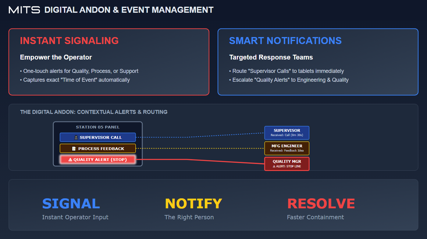 Andon and quality event workflows in MITS capture who raised the issue, when it occurred, what actions were taken, and how it was resolved. This creates a complete audit trail and supports accountability across teams.